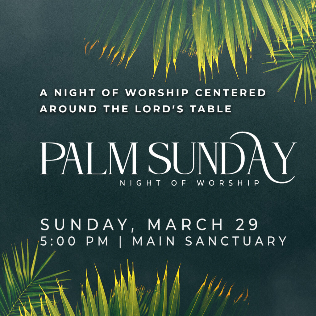 WORSHIP AT 8:30 + 11:00 AMPALM SUNDAY NIGHT OF WORSHIP AT 5:00 PM
